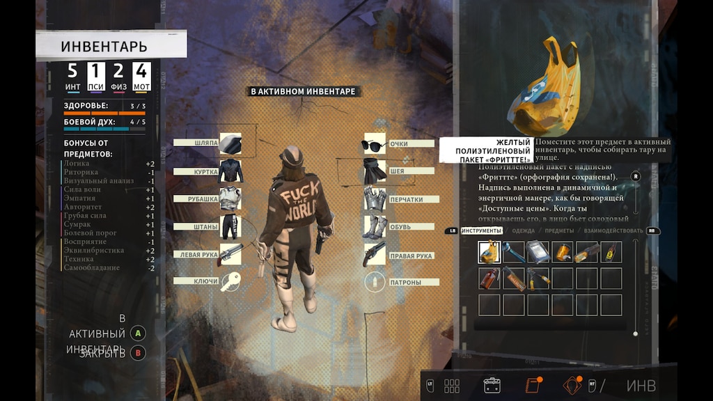 Да и вообще, крутите повествование и сеттинг как хотите. Находите интересные для себя вещи, прогибайте изменчивый мир под себя. Тут даже с одеждой всё круто. Редкая игра, где я собирал одежду просто “чтоб было”. Просто потому, что шмотка крутая. У наркош даже выкупал. У панков отжимал, с трупов снимал! И это весело и круто!