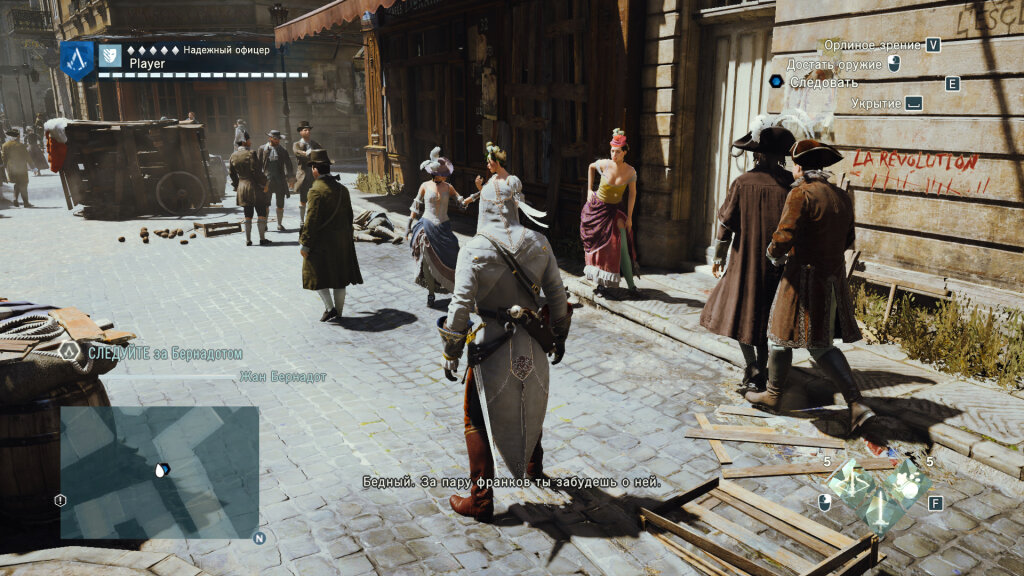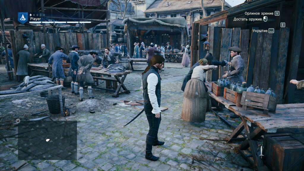 Да, кровавые события Французской революции позволят делать свои темные делишки скрытно, даже «под носом» у большого количества народа. Тут и там происходят жестокие побоища между гражданами, поддерживающими те или иные политические силы, по городу расставлены гильотины, позволяющие быстро и эффективно бороться с «врагами революции», местами валяются трупы, на которые горожане уже не обращают внимания. И где-то посреди всего этого хаоса Арно, ассасины и тамплиеры плетут свои интриги. На самом деле антураж и сеттинг – самые сильные козыри Unity. Действительно, порою по 5-10 минут можно просто «болтаться» по городу, разглядывая причудливые лозунги и вывески на местных лавках, слушать песни в пабах и смотреть спектакли в театре. Атмосфера в игре воссоздана великолепно, в происходящее веришь, и сомнений, что всё происходило именно так, не возникает.