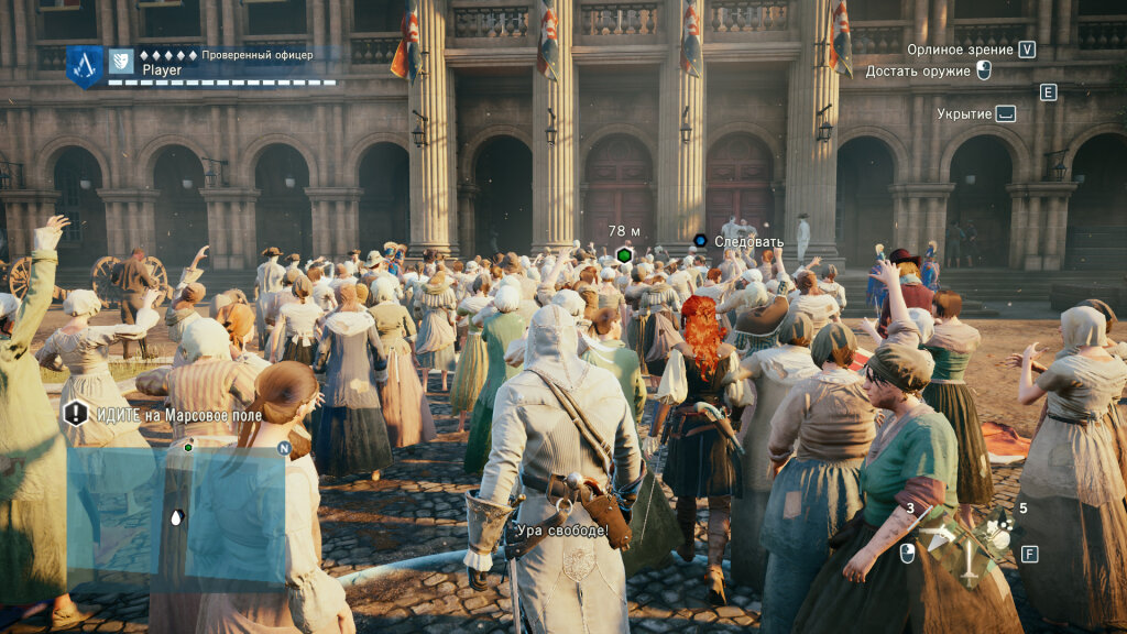 Ещё очень порадовало основное место действия игры – Париж. Впервые в серии город воссоздан в масштабе 1 к 1, включая такие небезызвестные достопримечательности, как собор Парижской Богоматери и Бастилия. Посетить, пусть и виртуально, столь легендарные сооружения, как минимум приятно. А теперь представьте, что в прекрасном развитом европейском городе конца XVIII века происходят народные волнения, переросшие в революцию, падение монархии и восхождение к вершинам власти небезызвестного Наполеона Бонапарта. Это даже звучит увлекательно, а уж поучаствовать в данных событиях кажется делом просто невероятно интересным. И Unity даёт такую возможность! На самом деле сеттинг игры просто потрясающе интересен и лично для меня является практически идеальным вариантом. Возможно, чуть более интересно было бы очутиться разве что в Петрограде образца 1917 года, но и Париж «убисофтовцы» смогли сделать просто чудесным. Помимо праздно шатающихся граждан, город населяют целые толпы недовольных митингующих, что-то рьяно требующих, стоя у правительственных зданий. И огромные – это действительно очень большие толпы народа, в которых можно как совершить убийство, так и невозбранно скрыться...