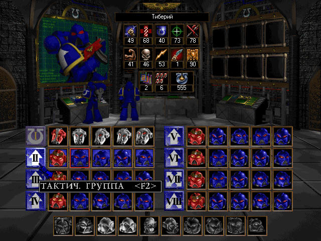 В нашем распоряжении взвод Космодесантников чаптера Ультрамаринов, состоящий из восьми отделений, по пять человек в каждом. Максимальное количество Космодесантников, которых вы можете взять для выполнения задания – 20 человек, то есть, четыре отделения. Командиры отделений (сержанты) носят шлемы, красного цвета. Все восемь отделений Ультрамаринов, различаются по своему типу.