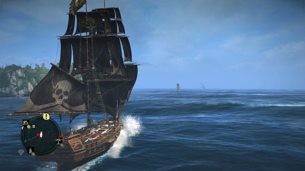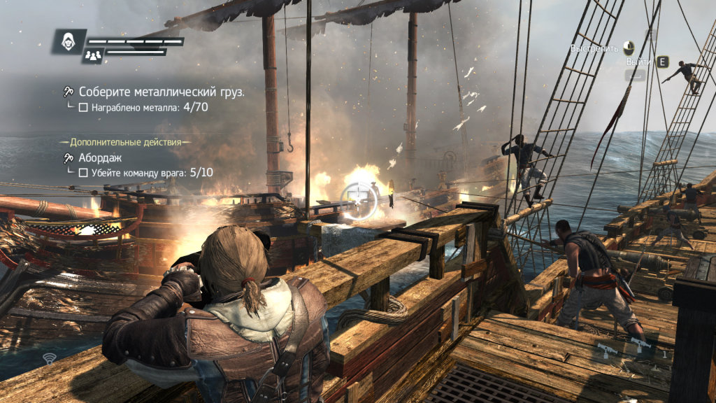 Что касается геймплея, то основные механики неизменны со времён Assassin's Creed 2 (её изменения я всё-таки считаю значительными по сравнению с оригиналом). Как и раньше, мы бегаем по крышам зданий, "синхронизируем" карту, собираем фрагменты памяти (прощайте, пёрышки) и выполняем миссии. Главной новой "фишкой" четвёртого Assassin's Creed являются море и геймплей на корабле. Конечно, возможность стать за штурвал и показать морским разбойникам, где раки зимуют, появилась ещё в Assassin's Creed 3, но в Black Flag понравившуюся идею решили развить, и теперь не менее половины игры мы проведём на корабле. Игровой мир представляет собой множество крупных и мелких островов в Карибском море, а передвигаемся мы по ним, соответственно, на кораблях, а точнее, на одном - носящем броское название "Галка". Управление осталось схожим с Assassin's Creed 3, а вот тактика ведения боя существенно изменилась. Во-первых, теперь мы стреляем из тех орудий, куда направлена камера. Смотрим вперёд - стреляем из носовых орудий; повернулись в сторону - лупим, соответственно, из бортовых; ну а коли развернулись назад - сбрасываем бочки с зажигательными снарядами. Если врагу был нанесён критический урон в какой-то области - можем выцелить её фальконетами. Есть ещё тяжёлые ядра, разносящие корабль при стрельбе вблизи, а также мортиры - дальнобойное прицельное оружие. Ну и про таран забывать не стоит. Комбинируя всё вышеназванное, получаем аркадный, но на редкость зрелищный бой, который в определённый момент можно закончить взятием противников на абордаж. Последний представляет собой этакую мини-игру, где нам нужно вырезать определённое количество команды противника (от 5 до 20 человек) - и иногда выполнить ещё какие-нибудь простенькие условия (срезать флаг корабля, уничтожить пороховые запасы, etc.). Взяв корабль на абордаж, можно починить "Галку", снизить уровень известности (пока, глашатаи) или отправить его в свой флот. Звучит здорово, да? На деле же захват кораблей в свой флот и дальнейшее их использование представляет собой унылую мини-игру вроде отправки ассасинов по всему миру для выполнения контрактов из предыдущих частей. Взяв корабль на абордаж, мы получаем его груз, а также прибавку к экипажу. Груз потом можно продать или потратить на улучшение корабля. Экономика при этом развита слабовато, и заниматься грабежами ради продажи грузов ооооочень скучно. В целом морские битвы радуют первые 5-10 раз, после чего жуткое однообразие начинает утомлять, и в ходе морских заплывов стараешься вовсе чужие корабли не задевать. Впрочем, совершать такие заплывы через всю карту не обязательно, - разработчики доработали систему быстрого перемещения, и если вы уже разок побывали на каком-нибудь острове - то сможете без проблем переместиться туда в любой момент времени.