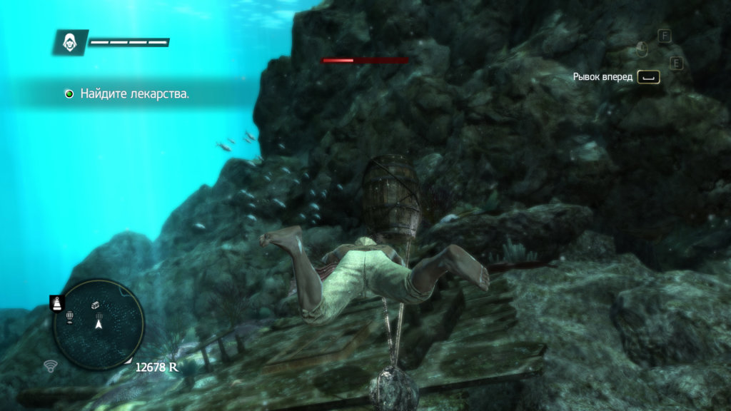 Как уже упоминалось, геймплей на суше существенных изменений не претерпел и даже, на мой взгляд, был несколько урезан. Количество дополнительных миссий сократилось исключительно до контрактов на убийства (зато появились аналогичные контракты для кораблей), очень однообразных и унылых. Куда делись многоступенчатые дополнительные задания из Assassin's Creed 3? Остались они, если честно, в количестве ровно четырёх штук, представляющих собой миссии для поиска ключей тамплиеров и получения отличной брони. Почему разработчики решили уменьшить их количество - сказать трудно. Правда, появились другие забавные занятия, среди которых поиск и сбор бутылок с посланиями, поиск камней племени майя и, самое интересное, - поиск закопанных сокровищ. Для того чтобы найти клад, нам нужно сперва отыскать карту, на которой будут отмечены широта и долгота острова, а затем, ориентируясь по начертанному, нужно определить, где начать копать, дабы отыскать вожделённый клад, в котором, помимо золота, могут находиться чертежи, необходимые для улучшения "Галки". Идея очень хороша - и реализована, на мой взгляд, весьма достойно. Появились и так называемые подводные миссии, когда Эдвард ныряет с колоколом под воду в местах крушения кораблей с целью поиска разбросанных по дну сундуков. Мешать в сборе имущества нам будут акулы и прочие куда более мелкие морские обитатели, а также банальное отсутствие воздуха. Не то чтобы подводные уровни очень интересны, но некоторое разнообразие в игровой процесс они вносят, да и выглядят просто потрясающе. Ненавидимый мною в Assassin's Creed 3 крафтинг претерпел существенные изменения - и в таком виде, как он представлен в Assassin's Creed 4, стал вполне вменяем. Дело в том, что мы создаём улучшения вроде увеличения здоровья или размера сумок за счёт охоты, т.е. насобирали несколько шкур бобра - сшили из них новый костюм. Не хочется заниматься охотой? Не проблема - можно все недостающие ингредиенты просто купить, хватило бы только денег. Охота, кстати говоря, также немного видоизменилась: в частности, были убраны всякие ловушки, приманки и прочее. Так что берите любимый пистолет или клинок - и вперёд, вырезать различных зверюшек с целью изъятия ценного меха и внутренностей. Появилась в игре и водная охота - или скорее рыбалка, в ходе которой мы можем ловить различных акул и китов. Специально для этих целей была сделана достаточно интересная мини-игра, в ходе которой мы с гарпуном гонимся за добычей, ну а шкуры и кости морских обитателей также используются для крафта или идут на продажу.