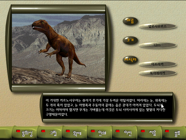 Южнокорейская образовательная программа, сочетающая в себе интерактивную энциклопедию динозавров (а также плезио- и птерозавров), приятно удивляющую своим охватом и проработкой материала, и сборник "jigsaw puzzle'ов" - тоже весьма радующий своим размером.