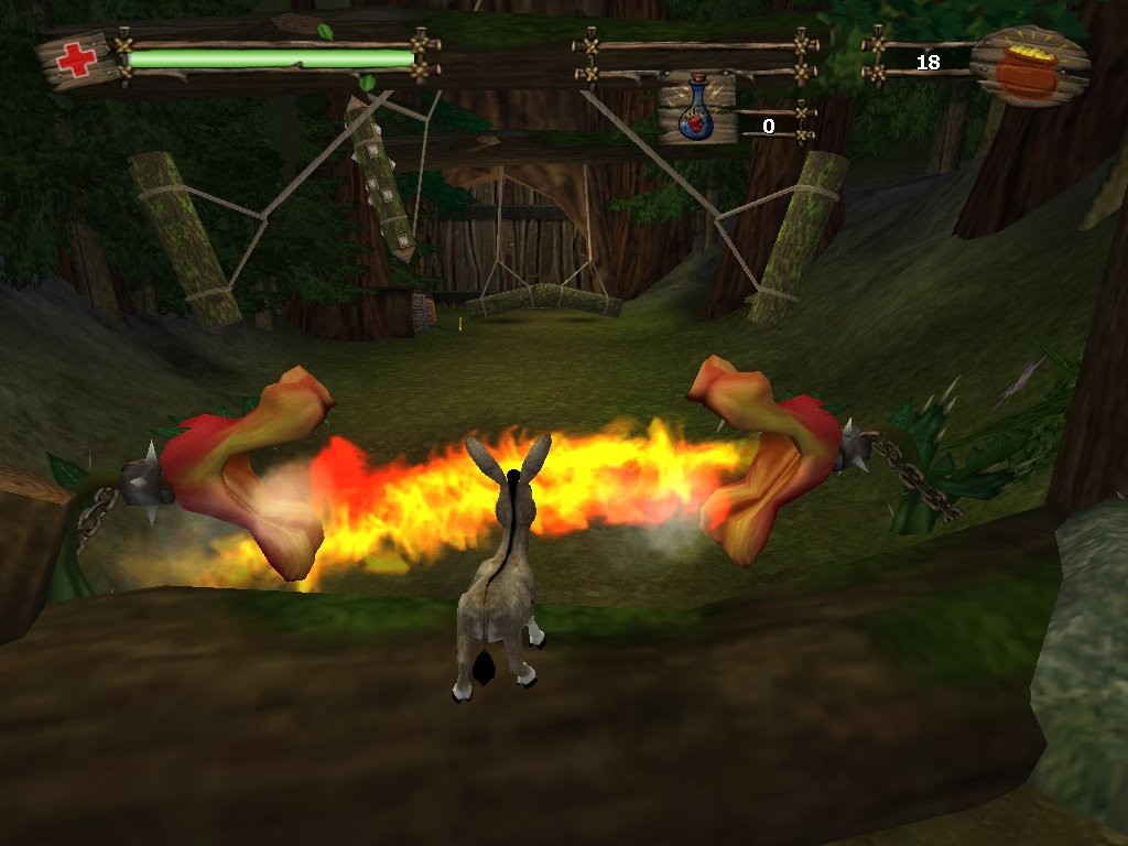 Однако продолжим рассказ о Shrek 2: The Game. Это нетрудный платформер с драками и сюжетом, разработанный на движке Unreal Engine. На разных уровнях игрок управляет то Шреком, то Ослом, то Котом (а на одном уровне ещё кое-кем), но серьёзных различий между ними нет (только по размеру и силе; например, Кот слабее остальных, зато может пролезать в норы), и это серьёзный минус. Бой ведётся как в простеньких бит'эм'апах: только пара-тройка видов ударов да прыжки. Платформенная часть более интересна - в ней много препятствий, "батуты" из громадных листьев, ловушки, взрывчатые вещества, высокие деревья и здания, туннели, озёра... и, естественно, рычаги для механизмов и дверей. Прыжки с высоких мест смягчаются стогами соломы, как и в более современном экшене-платформере Assassin's Creed.