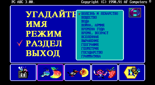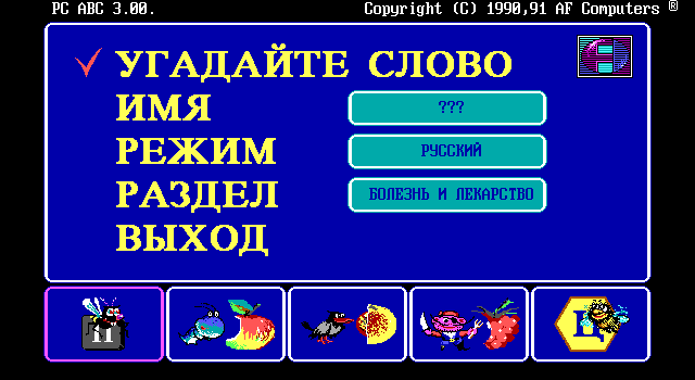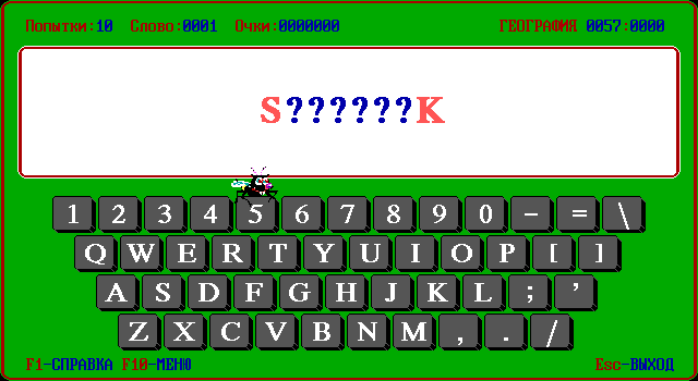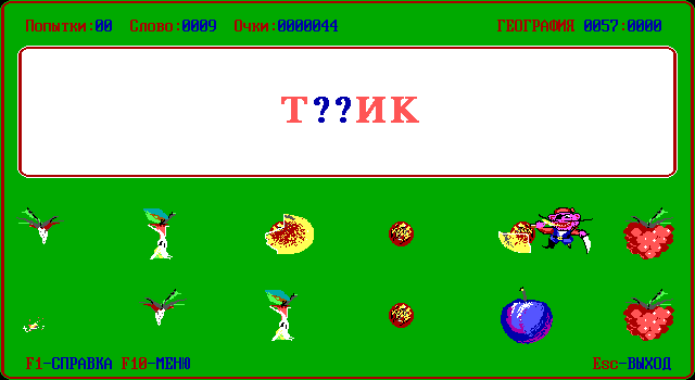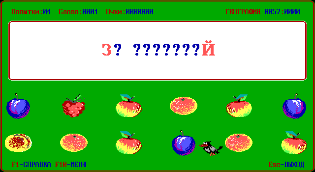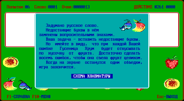 Но самое главное другое. Помимо языка и темы, нужно выбрать себе спутника. Их пять видов. Первый – пчёлка. Если выбрать её, на экране под окошком со словом будет нарисована клавиатура, и пчёлка начнёт перелетать с клавиши на клавишу, показывая, кнопку с какой буквой нажимать. Этот режим ориентирован либо на детей, либо на тех, кто очень плохо владеет клавиатурой (всё-таки на дворе был 1990-й). Затем идут три режима: с червячком, вороной и пиратом. Здесь вместо клавиатуры изображены двенадцать фруктов; при нажатии клавиши с буквой, которой в слове нет, спутник съедает часть фрукта (какую именно часть, зависит от того, кого вы выбрали: червяк ест медленнее всех, пират – быстрее). Игра продолжается до тех пор, пока все фрукты не съедены. Наконец, в последнем режиме – самом сложном – с нами снова пчёлка, только на этот раз помогать она не настроена. Вместо клавиатуры – соты с буквами. Как только игрок нажмёт любую клавишу с буквой, насекомое начнёт летать от соты к соте, удаляя оттуда буквы. При этом, как только она удалит ту букву, которая в слове есть, но ещё не отгадана, наступит конец игры. Данный режим может оказаться сложным даже для взрослых.