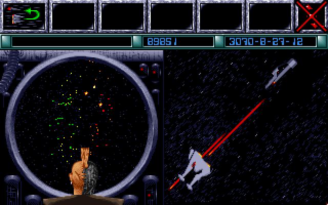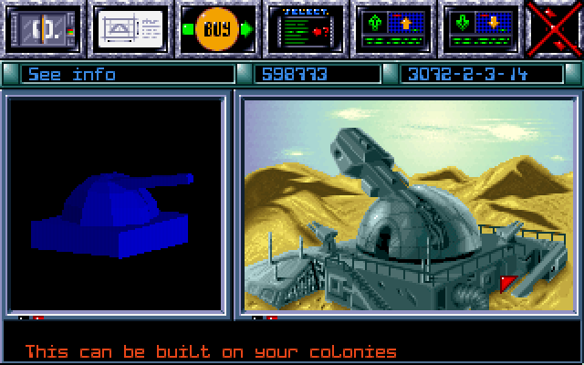 Ну и последний аспект, с которым рано или поздно придётся столкнуться, – боевые действия. Изначально оружия у колонистов нет, но с развитием сюжета у вас появятся наземная и космическая техника, а также масса врагов, против которых её придётся применять. Бои космические от нас почти не зависят. Просто включается экран, на котором зелёные точки перестреливаются с красными, а когда у одной из сторон точки кончаются, нам показывают результаты и список потерь. Решающие факторы здесь - опыт генерала (а не адмирала, что странно) и число/оснащение кораблей. Наземные бои устроены немного иначе: вы видите карту участка планеты а-ля Dune II, слева – ваша зелёная техника, справа – красная вражья. Управление идентично Дюне: move, attack. Приказы отдаются индивидуально, рамкой юниты обвести нельзя. Особого разнообразия в тактике тоже не ждите, всё прямолинейно: танки лучше броневиков, самолёты лучше танков, ракетные установки лучше самолётов. Выигрывает обычно тот, у кого больше войск и опытнее генерал.
