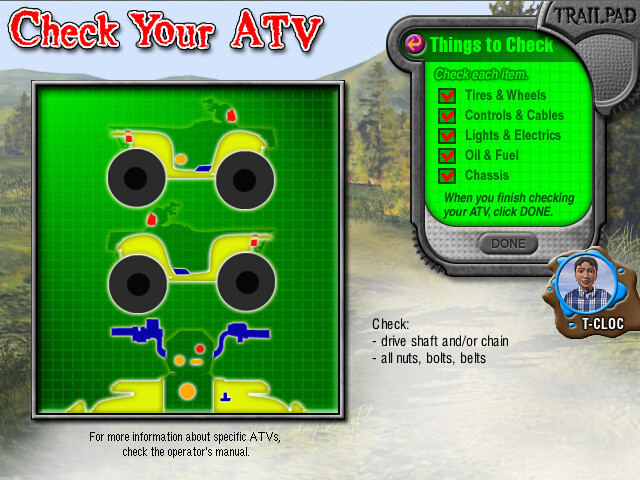 Перед тем как начать заезды, нужно основательно подготовиться. Во-первых, выбрать квадроцикл, - это сделает за вас программа после ввода данных: возраст, пол и желаемая мощность. Затем идёт тест на знание техники безопасности и основ управления этим транспортным средством. Наконец, третий этап - подготовка. Нужно проверить исправность квадроцикла, поставив галочки во всех пунктах, экипироваться по всем стандартам (шлем, очки, специальная одежда) и ещё раз отметить все пункты так называемых "золотых правил", которые нужно неукоснительно соблюдать.