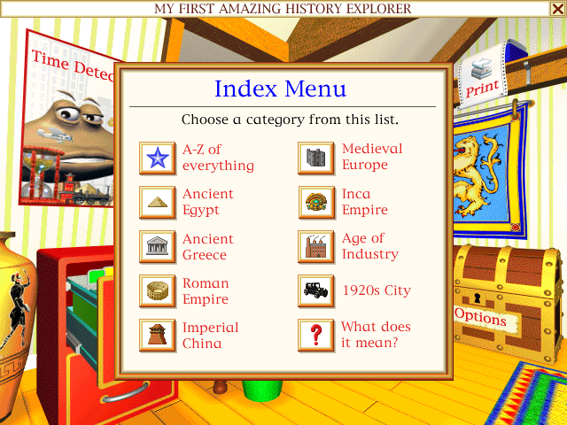 Нет, это ещё не всё. Вернёмся в главное меню. Там ещё есть чем заняться. Практически на каждую вещь в лаборатории можно кликнуть. Большая часть объектов при этом даже как-то отреагирует. Но только отдельные, около которых есть большие надписи, позволят сделать что-то особенное. Кинопроектор (Show me) покажет, чем же можно здесь заняться. Плакат (Your Mission) повторно расскажет о том, зачем мы здесь. Шкаф-картотека (Index) позволит прочитать любую информацию из всех временных периодов ещё раз, чтобы не лезть в дебри эпох. Сундук (Options) приведёт к настройкам. Их тут, впрочем, не так уж и много. Альбом (Time Travel Journal) позволит увидеть все наклейки-стикеры, фотографии и дополнительные комментарии, что мы занесли в него во время путешествия. Иконка принтера (Print, присутствует везде) позволит распечатать снимок экрана, если кому-то это необходимо. Остались три мини-игры и дверь (Quit). Назначение последней, пожалуй, очевидно, поэтому не будем о ней говорить. Рассмотрим существующие мини-игры.