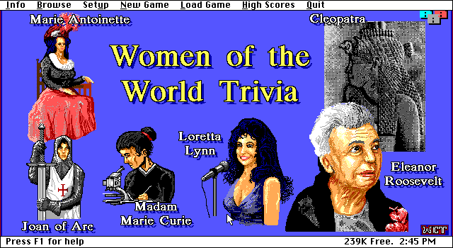 В Women of the World Trivia нам будут задавать вопросы о знаменитых женщинах, их биографиях и о том, чем они известны. Эпохи и сферы деятельности разные - достаточно посмотреть на титульный коллаж: царица Египта Клеопатра, королева Франции Мария-Антуанетта, Жанна Д'Арк, великая учёная Мария Кюри, певица Лоретта Линн и первая леди США Элеонора Рузвельт. Вопросы в игре разбиты на категории: женщины, известные в науке/искусстве/спорте/медицине/политике и других сферах, правительницы, а также оставшиеся в истории как чьи-то жёны/матери/дочери.