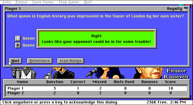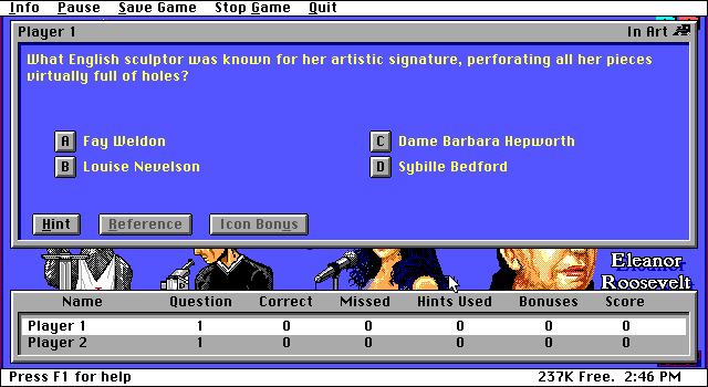Викторина от Software Creations. К сожалению, доступна только ограниченная shareware-версия, в которой всего 105 вопросов, в то время как в полных - Classic и Deluxe - их 300 и 600 соответственно. Тем не менее весь функционал, включая подробные настройки, полностью доступен.