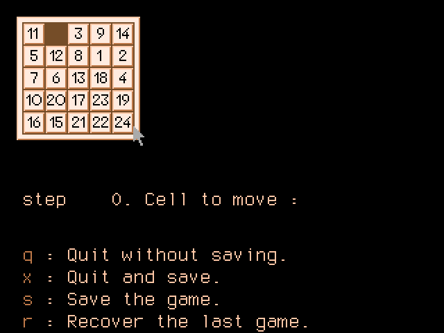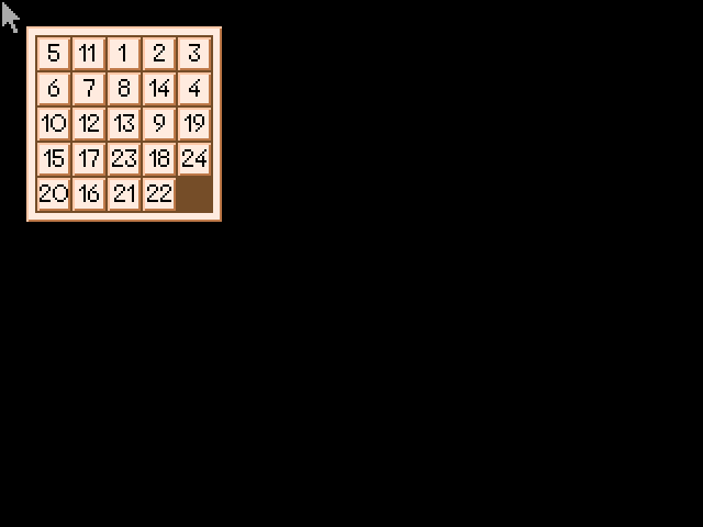 Пятнашки с увеличенным размером игрового поля (25 клеток, 24 плитки), которые отличаются наличием парсерного ввода команд (!), что делает их уникальными. Чтобы подвинуть ту или иную плитку, нужно набрать на клавиатуре написанное на ней число и нажать Enter. Казалось бы, что сложного в наборе одного-двух символов? Но представьте себе, сколько шагов нужно сделать, чтобы сложить пятнашки! А здесь ещё и поле больше. Самое интересное - что заставило создателей этой игры выбрать именно такой экстравагантный способ отдачи команд: ведь на тот момент уже была создана уйма пятнашек с нормальным управлением стрелками. Если это сделано ради оригинальности, то цель достигнута, но об удобстве и речи быть не может. Конечно, присутствует и управление мышью, но парсер явно предполагался как основной способ.