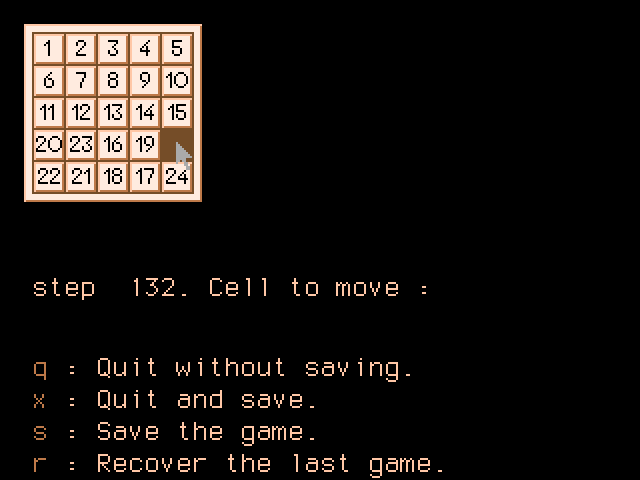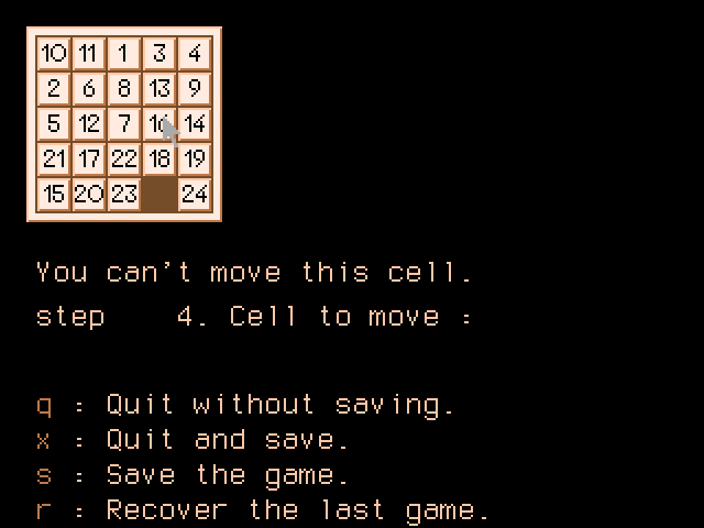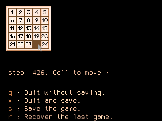 Видимо, авторы всё же понимали, что решение их версии пазла займёт много времени, а потому реализовали возможность сохраняться. Графика очень проста: сама доска занимает меньше четверти экрана, а куда большая площадь отведена под список команд сохранения, загрузки, начала новой игры и выхода. Вся правая верхняя четверть просто пустует.