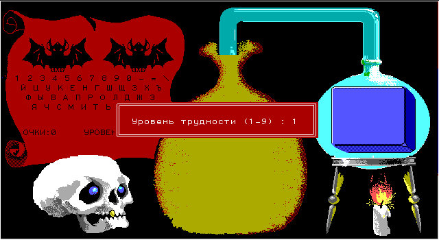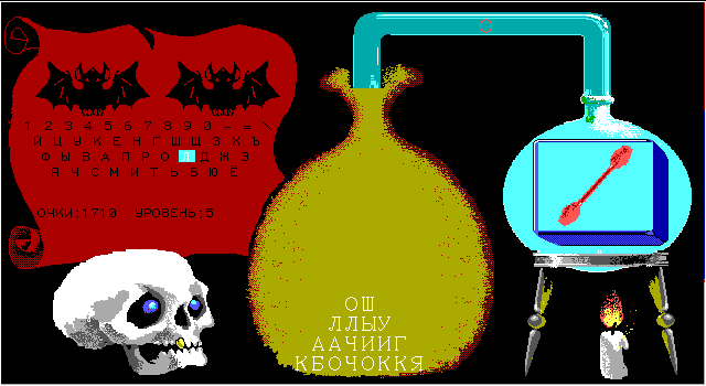 2. "Лови слово". Ещё один клавиатурный тренажёр, также на двух языках. На сей раз мы перемещаемся в лабораторию алхимика: на огне греется реторта, в которой появляется картинка, а по трубке начинает двигаться слово, обозначающее нарисованный объект. Цель игрока - успеть набрать приведённое название без ошибок. Уровней также девять.