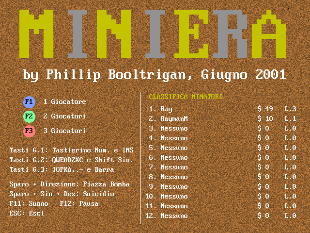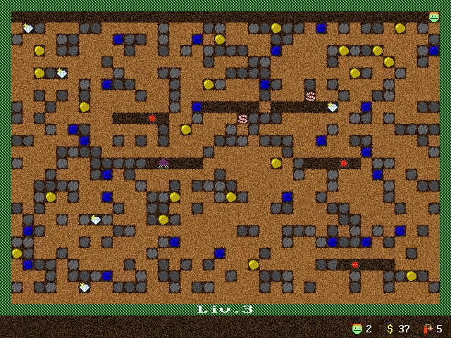 Перед вами любительское итальянское творение, являющееся клоном незабвенного Boulder Dash. Основы игрового процесса едва ли чем отличаются по своей сути от многих предшественников, так что на них долго останавливаться не будем. И снова мы играем «колобком», который прорывает тоннели под землёй в поисках жёлтых шаров (видимо, золота) и бриллиантов (уже огранённых). Нашли все в пределах экрана? Это приводит к окончанию уровня. Герою мешают камни, которые так и норовят свалиться на голову несчастному и расплющить, оставив кучу красных брызг, а также враги. Некоторые только ходят туда-сюда лишь по расчищенным местам, какие-то сидят в засаде, ожидая нас, а остальные (например, червяки) спокойно шастают по карте. К счастью, они далеко не интеллектуалы, поэтому быстро себя изничтожают, попадая под булыжники.