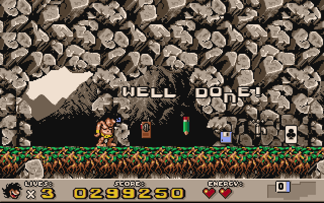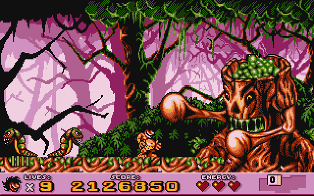 Противников у нас хватает: пауки, медведи, львы, птеродактили, гигантские ящеры и прочие образцы флоры и фауны комикзойской эры. Отличаются они не только внешностью, но и поведением, тактикой нападения, а порой - даже интеллектом, однако роднит их одно - уязвимость к удару большой каменной дубиной по зубам. К счастью, этим грозным оружием наш дикарь владеет. Махать дубиной ему, а значит - и нам, приходится около половины игры, поскольку это не только оружие против монстров, но ещё и инструмент для поиска кладов, уничтожения некоторых препятствий и обнаружения секретных ступенек, ведущих к различным вкусностям.