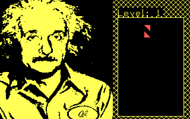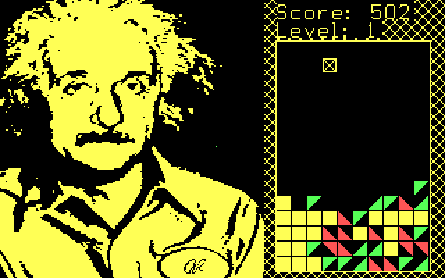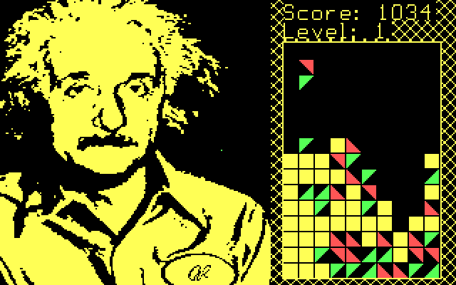 Выглядит xTetris своеобразно. После заставки с готическим шрифтом открывается основной экран, правую половину площади которого (даже чуть меньше) занимает стакан, а левую (даже чуть больше) - монохромный жёлтый портрет Альберта Эйнштейна. Выбор этого учёного в качестве "модели" по понятным причинам очень сомнительный, да и жёлтый цвет лучше бы заменить на другой.