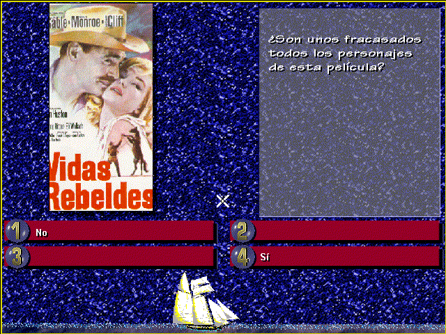 База вопросов, увы, по своим размерам средняя (если верить обложке, то их тут порядка 4700), причём большая их часть так или иначе связана с гуманитарными сферами. Определённое преобладание испанской тематики явно наблюдается, но без какого-либо "засилья": автору данных строк встретились вопросы по местным истории, географии и кинематографу, а вот по политике, телевидению и даже спорту - нет (но в теории, конечно, они могут здесь быть). Надо отметить, что даже задания высшей категории сложности обычно нельзя назвать по-настоящему нетривиальными, - хотя, разумеется, заставить "почесать голову" некоторые из них (в том числе не связанные с испанскими реалиями) способны. Вариантов ответа по умолчанию четыре, но изредка попадаются вопросы с двумя: в них требуется установить истинность или ложность сообщаемого факта, выбрав пункты "Да" либо "Нет" соответственно. К некоторым заданиям прилагаются изображения (чаще всего имеющие прямое отношение к их сути: например, просят назвать показанного на фотографии киноактёра, город, в котором расположен представленный на снимке памятник архитектуры, или ещё что-нибудь), миниатюрные видеоролики ужасно низкого качества (и, что традиционно для игр поджанра, по факту обычно не помогающие принять верное решение), а также аудиальное сопровождение. Интересно, что относительно часто встречаются вопросы, требующие на слух опознать, на каком из музыкальных инструментов, чьи названия приведены на экране, исполняется звучащая мелодия. Дело дополнительно осложняется тем, что присутствует ограничение по времени, причём довольно жёсткое; выражено оно в виде анимированного "ползунка", перемещающегося в нижней части пространства и имеющего вид парусника, акульего плавника, чайки или ещё чего-нибудь.
