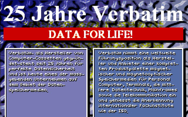 Рекламные игры - особый мир. Только в них можно оказаться в роли антропоморфного маркера-текстовыделителя или музыкального плеера. Только в них можно в роли зуба выдворять микробы изо рта. Сюжет и антураж их почти всегда не просто связаны с рекламируемым товаром, но и необычны, а качество варьируется от невразумительного бреда до едва ли не шедевров. Сегодняшний экземпляр, продвигающий продукцию фирмы Verbatim (дискеты, диски, кассеты), увы, относится к первой категории.