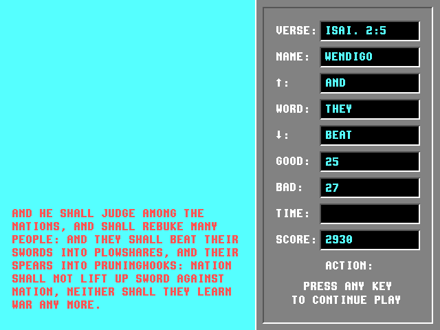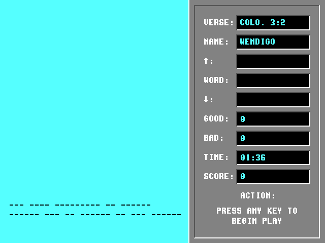 В существование выложенной на данной страничке игры трудно поверить, однако то, что она есть, - объективная реальность, и вы сами можете скачать её и убедиться, что это не мистификация. Если бы соотечественник Филипа Капусты и вместе с этим коллега по цеху разработки религиозных игр Дэн Шарп не создал аркаду, в которой нужно играть китом и проглатывать падающих с кораблей Ион (именно во множественном числе), то Here a Little, There a Little... однозначно получила бы звание самой оригинальной игры в данном направлении, - но так они, пожалуй, поделят первое место. Представляем вам религиозный тетрис!
