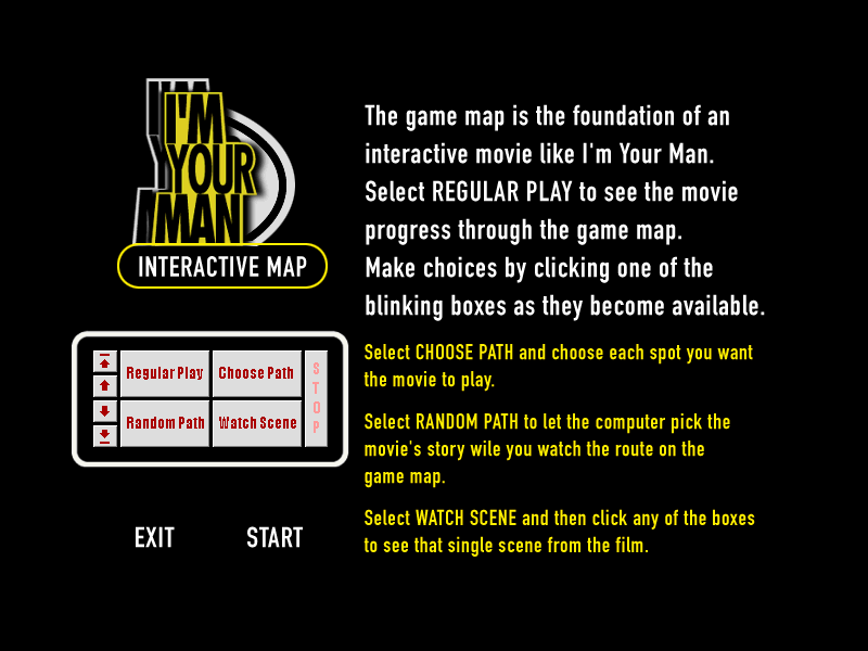 Но помимо прочего есть еще и часть, предназначенная для запуска в системах Windows, выполненная с помощью Macromedia Director как интерактивная карта. В этом варианте просмотр сделан в виде рут-схемы, где каждому фрагменту отведен свой видеофайл. Взаимодействовать с ней можно четырьмя способами: обычным (Regular Play, каждый фрагмент выбирается самостоятельно), настроенным (Choose Path, фрагменты выбираются заранее и далее проигрываются как целый фильм), случайным (Random Path, фрагменты выбираются случайным образом) и просмотром одной сцены (Watch Scene). Само видео показывается в небольшом окошке в левой части экрана, качество которого, само собой, уступает DVD-варианту (вместо 720х480 при 29,97 кадрах - 320х240 при 15 кадрах), но в то же время не так сильно распадается на артефакты и не требует специальной платы расширения для проигрывания. Windows-вариант, однако, сильнее обрезан в возможностях: нет начальных и заключительных титров и нельзя просматривать разные части трех вступлений (хотя места на диске еще хватало).