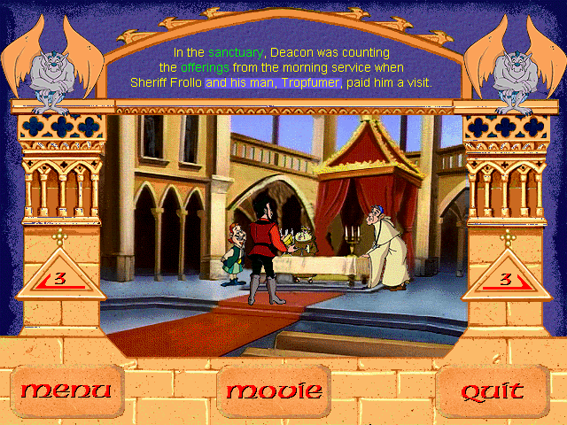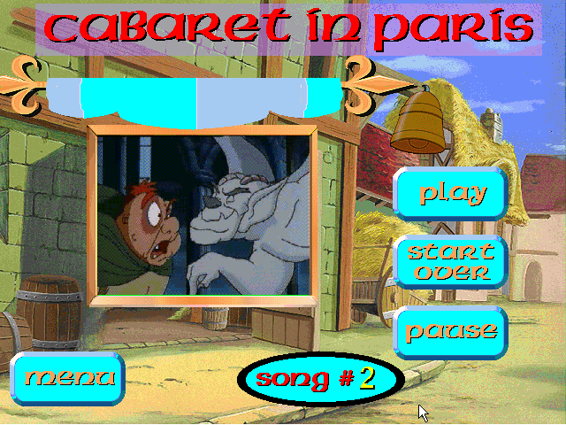 The Secret of the Hunchback Interactive Storybook представляет на первый взгляд именно то, что и указано в названии: интерактивную книгу-игру. Сразу же после запуска нам предлагают просмотреть вступительный ролик (первая пара минут мультфильма), перейти в главное меню, где нас и ждут полноценные способы провести время, или выйти. Чем же можно заняться? О, нас ожидают (в пункте Games) мини-игра а-ля виртуальный тир «Поймай Квазимодо и его друзей» (уже от одной этой фразы можно как минимум нахмуриться) и партейка в пятнашки, где в качестве полотен взяты лица персонажей. По соседству расположено распечатывание раскраски на принтере (Coloring Book). Остальной ассортимент стандартен: бездумно прослушать историю в очень кратком виде (Read to Me), прокликать всё лично (Let Me Play), перейти на определённую страницу (Page Jumper), посмотреть мультфильм целиком (Movie Theatre, но зачем нужен вступительный отрывок в самом первом меню в таком случае – загадка), глянуть четыре песенных клипа (Sing To Me). Как видно, по своим возможностям «Секрет горбуна» очень недалеко ушёл в сторону от раннего творения студии - Young Pocahontas Interactive Storybook (1995, Windows 3.x).