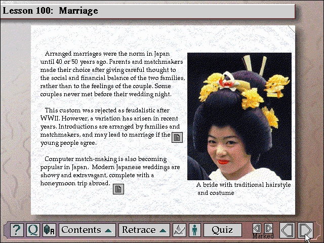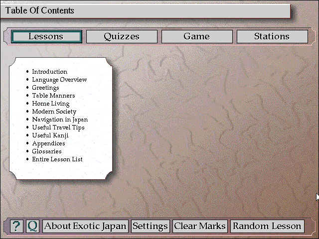 Уроков в наличии имеется 165 штук (плюс 13 дополнительных материалов), и они посвящены, как уже упоминалось ранее, практически всему. Даже присутствует информация касательно получения японской визы. Правда, уже устаревшая: ведь Exotic Japan вышла в 1995 году, а с тех пор многое успело поменяться. Основываясь на прочитанном материале, можно поотвечать и на различного рода вопросы. Их также 165, по штуке на соответствующий параграф. В процессе ведётся статистика правильных ответов и подсчитывается наша «успеваемость» в процентах. Награда за отличное владение материалом, впрочем, отсутствует. Единственная полноценная игра-ходилка, присутствующая на диске, является вариантом забавы «Змеи и лестницы», где вместо последних изображены журавли. Игроки по очереди «бросают» шестигранный кубик, кликая по нему (ИИ, правда, рассчитывает сам себя автоматически). На выпавшее значение продвигаемся вперёд. Всё стандартно. При попадании на квадрат с журавлём мы перемещаемся ощутимо дальше, а именно туда, куда указывает его клюв. Змея же отбрасывает назад. Впрочем, мало кинуть кубик с высоким или выгодным значением. Необходимо ещё и при попадании на новую клетку-станцию (при этом показывается соответствующая гравюра) успешно ответить на вопрос, взятый из режима Quizzes, – в противном случае нас вернёт на исходное положение. У компьютера таких проблем нет. Почему? Просто он всегда отвечает верно. При желании можно сыграть в данную забаву вдвоём и таким образом посоревноваться.