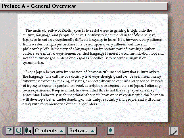 Перед вами мультимедийная энциклопедия, посвящённая Японии: её прошлому, настоящему, перспективам на будущее (каким его представляли в 1995 году), культуре и языку.