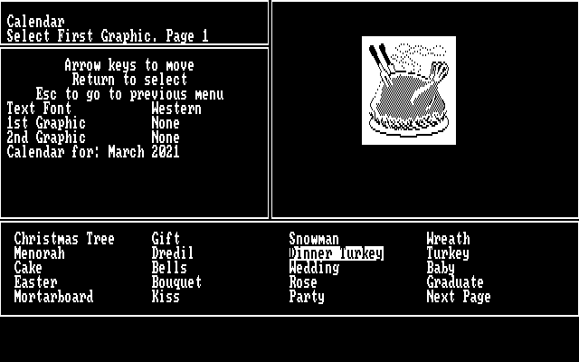 Назначение команды "Exit To DOS" очевидно, как и смысл раздела "Hardware Config": в последнем пользователю предлагалось провести не так уж и мало времени, определяя марку и настройки своего принтера, - но сегодня это развлечение вряд ли окажется особо популярным. Скорее стоит обратить внимание на пять пунктов, собственно и посвящённых созданию различного рода печатной продукции: "Poster" (понятное дело - плакат, с текстом, рамкой и рисунками), "Stationery" (различного рода бланки для письма), "Card" (поздравительные открытки и карточки), "Banner" (вывески, отчасти напоминающие плакаты, но более продолговатой формы) и - пожалуй, самое интересное - "Calendar" (трёх разновидностей - "на месяц", "на неделю с датами" и "на неделю без дат"). В каждом таком разделе - в зависимости от его предназначения - имеется возможность прописать подходящую случаю текстовую надпись, выбрать иллюстрацию, а временами и декоративную рамку или особо изящный шрифт. Картинку разрешается размещать по центру (например, на плакате, отрегулировав её размер) или по углам (на календаре: для такого дела можно выбрать как два одинаковых, так и два разных изображения).