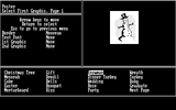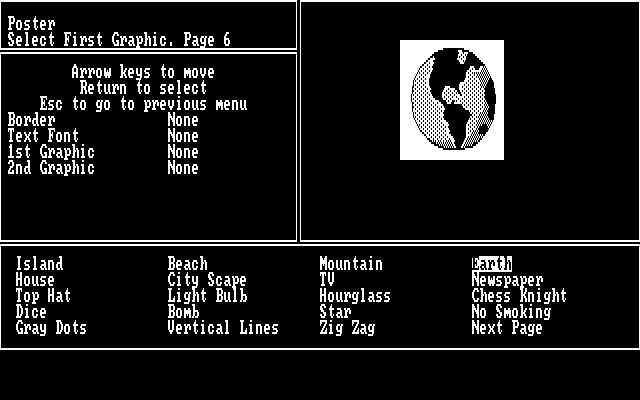 Правда, IBM PC улучшения по части внешнего вида почти что не коснулись: графика здесь по-прежнему исключительно чёрно-белая (красочной палитры пришлось ждать аж до 1993 года, принесшего пользователям DOS "PrintMaster Gold"). Впрочем, этого по большому счёту было вполне достаточно - с учётом того, что домашние принтеры на то время в любом случае были далеки ещё от возможности передавать на печати цвет. Главное меню программы, появляющееся после заботливого напоминания о необходимости выбрать и настроить это самое устройство для материализации плодов своего электронного творчества, содержит в себе сразу восемь пунктов, перечисляемых в нижней части экрана; для управления используются стрелки клавиатуры и "ввод"; слева вверху отображается краткое описание текущего экрана и выбранные уже настройки, а справа - подходящая случаю иллюстрация.