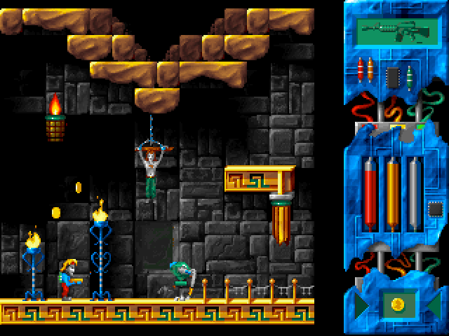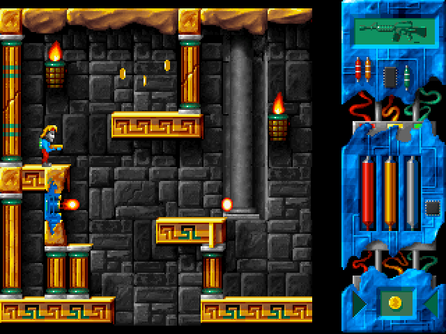 Управление более-менее интуитивно, - но представляется важным кратко описать как его, так и интерфейс. За прыжки и приседания отвечают соответственно "верхняя" и "нижняя" курсорные стрелки; последняя, кроме того, используется для подбора различных предметов (требуется встать прямо рядом с таковым и нажать её). Герой уже на момент старта вооружён, причём огнестрельным оружием (другого, собственно, тут и не встречается); атака осуществляется посредством "Ctrl". Всего в процессе прохождения удастся найти целых пять средств убиения, среди которых будут ракетница, автомат и менее тривиальные вещицы; то из них, что используется в данный момент, отображается в правом верхнем углу экрана, а переключаться между ними можно при помощи клавиш от "1" до "5" включительно. Интересно, что боезапас для всех этих штуковин общий (и это - одно из очень немногих здешних "упрощений"), однако сам по себе в любом случае конечный и расходуемый с сильно различающейся скоростью в зависимости от применяемого "ствола". Общий "принцип" здесь очевиден: чем мощнее оружие, тем больше оно "кушает".