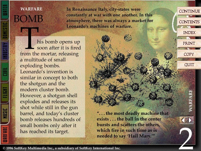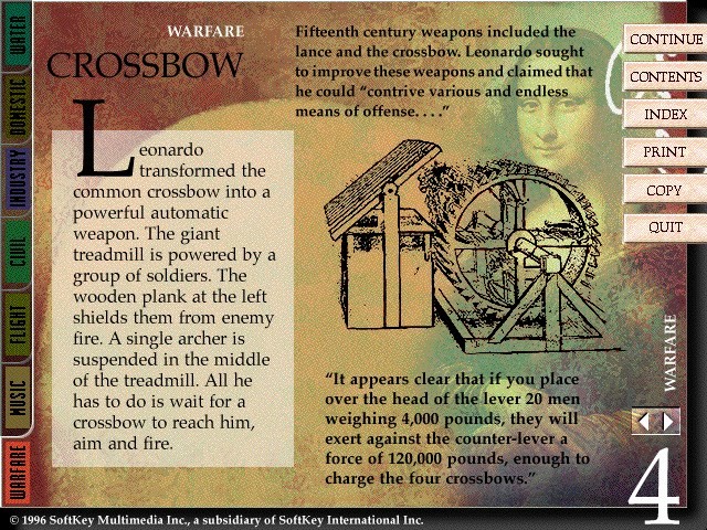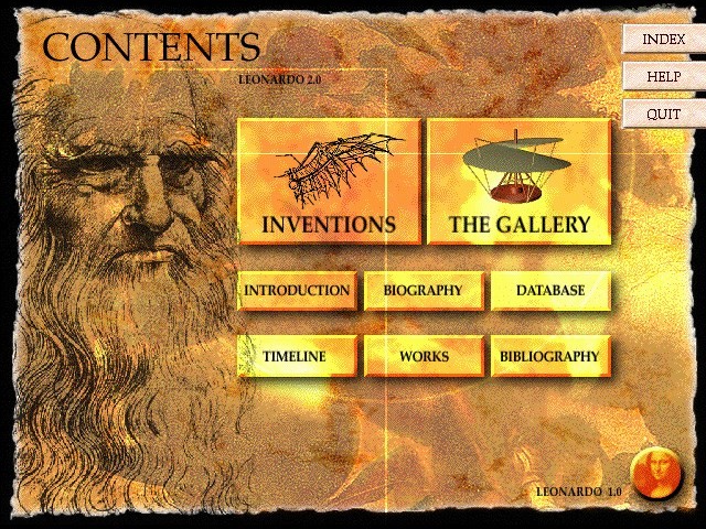 Итак, пробежимся по списку изменений второго издания. Начнём с того, что бросается в глаза: немного увеличилось количество видеороликов (хотя качество и кодек всё те же), изображений, текстовой информации, появилась вменяемая поддержка Windows XP, изменился интерфейс. В главном меню теперь красуется новый пункт – «Галерея». В нём мы можем посмотреть и прослушать во всех подробностях информацию об изобретениях Леонардо да Винчи, рассматривая соответствующие карточки. Реплик диктора стало гораздо больше, что определённо не может не радовать. Список изобретений, правда, не расширился. Видимо, дальше уже некуда. Удивительной кажется и возможность при помощи специальной кнопки запустить прямо из главного меню и Leonardo the Inventor (1995, Windows/Windows 3.x). Последнюю также разрешается открыть прямо с CD, - тогда возможен её запуск и под Windows 3.x.