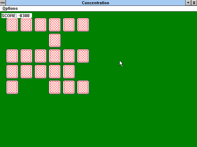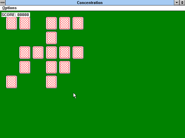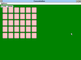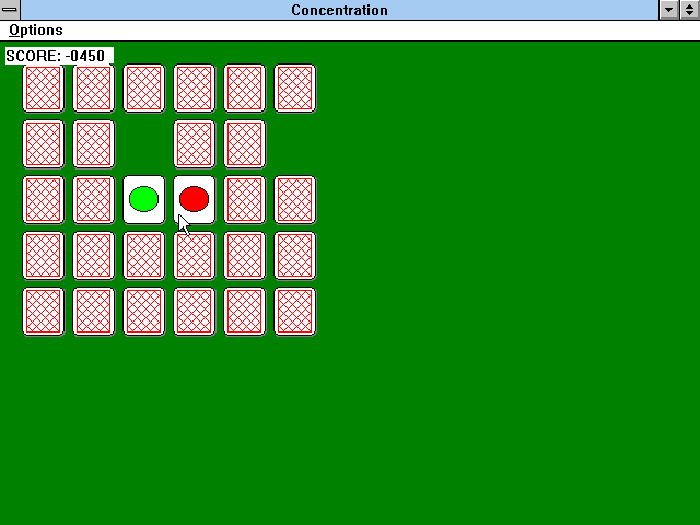 На игровом поле зелёного цвета разложены тридцать карт "рубашками" вверх - в пять рядов по шесть штук в каждом; к сожалению, изображения их весьма миниатюрны и не увеличиваются даже после растягивания окна "Concentration" на весь экран. Картинки на лицевых сторонах тоже крайне простые - всего лишь разноцветные круги (соответственно, пятнадцати вариантов палитры: задача явно не для дальтоников). Цель игры стандартна: щёлкая на картах поочерёдно и тем самым на несколько мгновений переворачивая их изображениями вверх, следует подбирать одинаковые пары, которые после этого благополучно исчезают. Процесс дополняет один только счётчик очков слева вверху: неправильный выбор (т.е. активация не совпадающих по цвету карт) наказывается штрафом в пятьдесят баллов, тогда как успешное действие приносит в копилку пользователя целую сотню условных единиц.