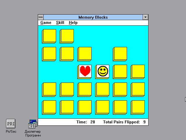 Третья игра называется "Memory Blocks" и является не чем иным, как разновидностью "парных карт": куда уж без них. Роли обычных карточек тут исполняют жёлтые объёмные квадратики, которые требуется с той же самой целью переворачивать один за другим в попытке отыскать два объекта с одинаковыми рисунками на лицевой стороне (таковые представляют собой самые разные изображения: смайлик, дискету на 5,25 дюйма, "бабку" из игры "Jacks", дерево и т.д.). Примечательно, что после открытия несовпадающие картинки не закрываются сразу, а продолжают оставаться перевёрнутыми: одну из них сразу можно дезактивировать, тем самым продолжив поиск пары для оставшейся. На выбор имеются два уровня сложности ("маленькое поле" на тридцать кубиков и "большое" на аж шестьдесят) и столько же режимов игры - помимо одиночного доступен и многопользовательский вариант развлечения, в котором двое игроков состязаются на предмет того, кому удастся составить больше пар. Счётчик перевёрнутых квадратиков (вне зависимости от их одинаковости) ведётся в правом нижнем углу экрана, рядом с индикатором прошедшего от начала игры времени; наиболее удачливые пользователи вознаграждаются занесением своих имён в таблицу рекордов вкупе с показателем затраченных на это дело секунд.
