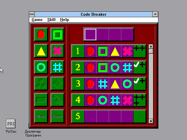 Наконец, "Code Breaker" - разновидность популярной забавы "Быки и коровы" (она же "Mastermind"). Компьютер задумывает некий код: в меню "Skill" можно выбрать как его величину (от двух до семи символов включительно, а по умолчанию - четыре), так и количество задействованных в нём элементов (соответственно, от двух до десяти, а в исходном варианте - шесть). В левой части экрана расположены кнопки с объектами этого самого кода: красным кружком, жёлтым треугольником, зелёным квадратом и др. (если, конечно, вы не отключили в меню "Game" опцию "Color"), - их и требуется поочерёдно нажимать, тем самым выводя на строке справа вверху свою "догадку" (убрать случано набранный неверный символ можно при помощи правой кнопки мыши). Нажатие на значок "Done" слева внизу отправляет это предложение на рассмотрение ИИ, который в ответ сообщает в пронумерованных по числу попыток строчках справа, насколько близок наш вариант к искомому: один, два или три чёрных "плюсика" символизируют точную догадку вплоть до позиции, тогда как белая "птичка" намекает на то, что объект был проставлен нами в принципе правильно, но не на своём месте. Число попыток ничем не ограничено, но обратите внимание, что один и тот же символ может быть задействован в коде не один, а большее количество раз.