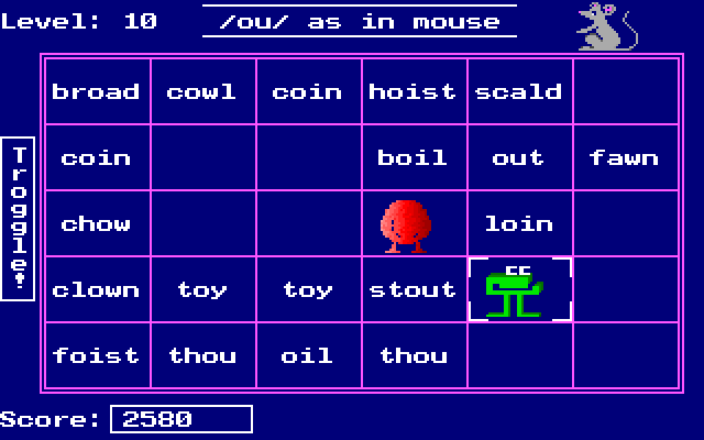 Суть процесса практически не отличается от всех последующих выпусков серии, включая представленную уже на нашем сайте «Trivia Munchers Deluxe». Ознакомившись с традиционно для MECC подробным и познавательным руководством пользователя и при желании наведавшись в не менее богатый возможностями раздел «Options» главного меню, предназначенный для родителей и учителей, нажимаем на «Play Word Munchers» – и оказываемся на первом из в буквальном смысле бесконечного числа здешних уровней. Экран игры представляет собой табличку о тридцати ячейках (шесть рядов по горизонтали и пять по вертикали), в каждой из которых размещается какое-то слово; вверху, рядом с номером текущего этапа, значится постановка задачи в лице того или иного гласного звука английского языка, сопровождаемого соответствующей мини-иллюстрацией. Например, это может быть долгое ‘o’, как в слове «boat» (наглядно изображаемом в виде лодочки), краткое ‘i’, как в «kite» (картинка воздушного змея прилагается) или дифтонг вроде ‘ou’ (соответственно, визуализируемый мышкой – «mouse»). Перемещая своего «жевуна» по клеткам при помощи стрелок клавиатуры, необходимо «съедать» (посредством нажатия «пробела») одно за другим все те слова, в которых присутствует искомый звук. Из других клавиш задействованы также «ввод» для постановки игры на паузу, «Esc» для выхода в меню и сочетание «Alt-S» для опционального отключения звука (представленного исключительно редкими эффектами и краткими мелодиями в сольном исполнении PC Speaker). Внешний вид игры, кстати говоря, несколько скромен: поддерживаются и CGA, и EGA, и VGA, но возможности полюбоваться разнообразием и красочностью палитры почти что не представится.