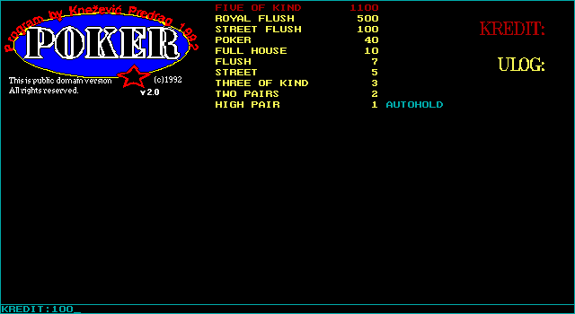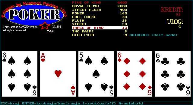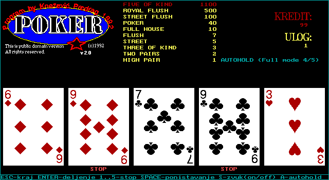 Poker – это одна из простейших реализаций покерного автомата. Подобных выходило великое множество. Poker, однако, отличается от них зачатками автоматизма, а также выделяется своим сербским происхождением. В остальном тут ничего интересного массам нет – уж больно специфический жанр. Играли в одну такую – почитай, что видели их все.