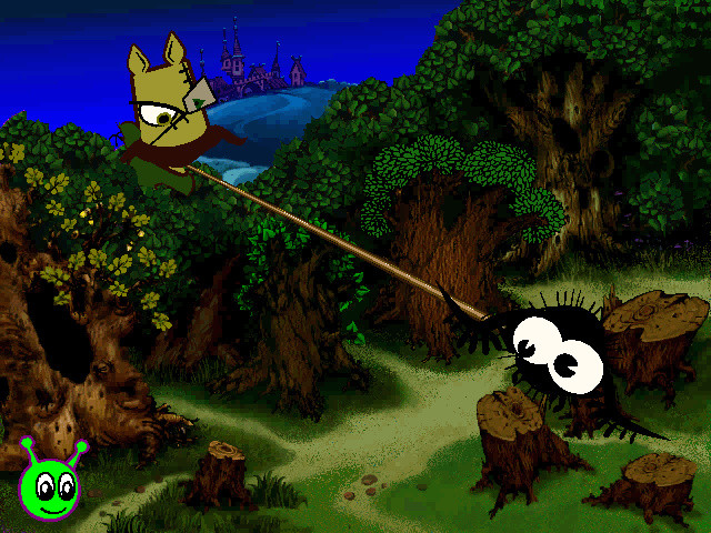 Значок мяча позволит совершить путешествие по локациям из сказки, только без героев. Зато фоны теперь наполнены активными точками, нажатие на которые вызывает различные шуточные действия, к сюжету не имеющие отношения. Есть даже постоянный герой таких сценок - человечек с коробкой на голове.