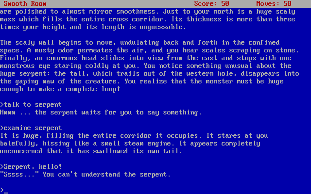 По слухам, её создали в качестве "ответа" на жалобы ветеранов, которым не нравилась простота и новизна работ компании 1984-1985 гг. вроде "Seastalker", "Wishbringer" или "A Mind Forever Voyaging", где или всё проходилось сравнительно легко, или вообще не было никаких загадок. Ну, что же - теперь у нас практически одни загадки! Даже карта почти не нужна, всё более-менее камерно. Но вот эти кубики - их изобилие, в меру открытый мир и элементы нелинейности вкупе с тупиками делают прохождение запредельно сложным. Интересно, как оно покажется мастерам мистоидов?