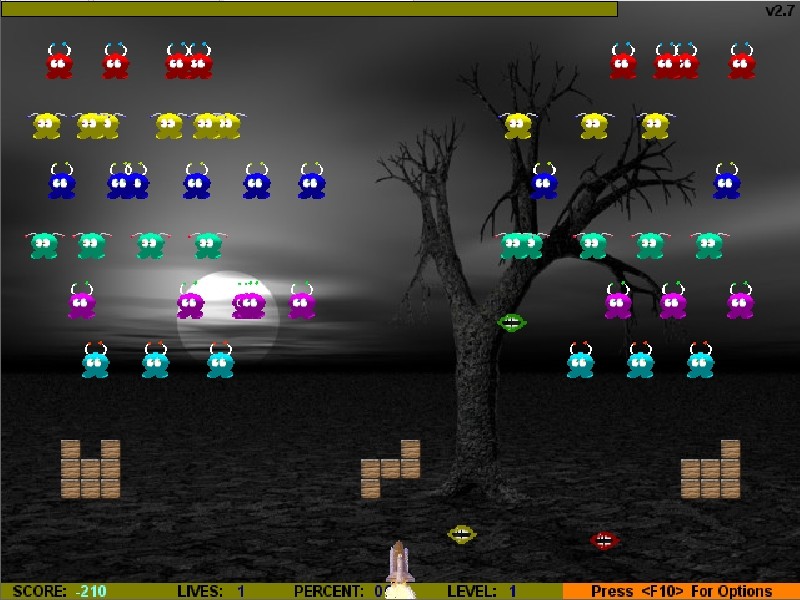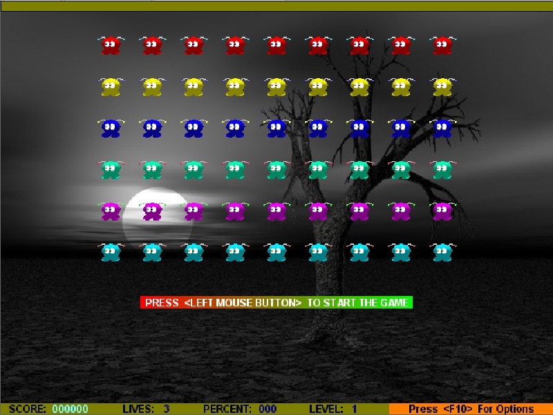 Игра представляет собой вариант популярной Space Invaders и одновременно с этим включает в себя элементы из… Floppy Killer (извините, похожего аналога я не нашёл). Суть такова, что мы, управляя ракетой, двигая её вправо или влево стрелками и стреляя клавишей «Пробел», должны уничтожить всех противников в игровом поле. В качестве них выступают разноцветные инопланетяне; за убийство каждого даются очки. Учтите, что нужно постоянно уворачиваться от их снарядов, представляющих собой рты того же цвета. Летят они с большой скоростью, из-за чего игрок может не успеть от них увернуться. Добавьте ещё и то, что эти снаряды движутся по направлению к вам и после того, как вы убили выпустивших их противников. К счастью, периодически появляется бонус в виде лица инопланетянина, который на время даёт неуязвимость игроку. Чтобы его получить, нужно всего лишь попасть в соответствующий объект, пока тот не покинул пределы экрана. Также можно увеличить очки, пристрелив время от времени пролетающего вдоль экрана пегаса.