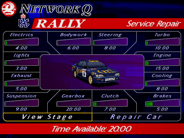 Зато в данной игре вам дается одна единственная машина на весь чемпионат, 20 минут в сервисной зоне и 45 минут между спец. участками - весь запас ремонта. 15 минут чтобы перебрать мотор, 5 минут на ремонт тормозов. Чуть помяты фары, электрика барахлит, впрыск, подвеска, кпп, сцепление, кузов, рулевая система, турбина, охлаждение - всё на потом.