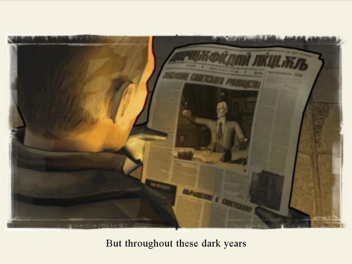 Здесь надо заметить, что атмосфера в Republic: The Revolutuon, как ни удивительно, "многомерна". На первый взгляд игра может показаться самой что ни на есть "клюквенной": чего стоят одни только надписи (будь то газетные лозунги или вывески на зданиях), представляющие собой бессмысленные сочетания почти исключительно согласных букв расширенной кириллицы (с добавлением литер из некоторых других алфавитов, включая немецкий и глаголицу) с очень обильным использованием "Ъ", а также, разумеется, озвучка всех здешних персонажей. Последняя - вообще, что называется, "отдельная тема": создаётся впечатление, что авторы взяли определённое количество слов из всех восточно-, западно- и южнославянских языков, а также немного венгерских, баскских и ещё каких-то, после чего исказили каждое из них до неузнаваемости, перемешали, после чего сдобрили ещё чем-то - тем, что как раз и делает здешнюю речь столь необычной, - а в качестве "вишенки на торте" добавили буквально несколько грамматически корректных слов и выражений, озвученных на безупречном русском языке без малейшего акцента (!). В результате беседы, составляющие малую, но немаловажную часть игрового процесса, выглядят примерно так: "[Тарабарщина], конечно, [тарабарщина], потому что я согласен с вами". А самое "смешное" во всём этом то, что некоторые зарубежные игроки - из числа тех немногих, кому данная вещь оказалась интересна, - искренне полагают, что слышат реальный русский язык...