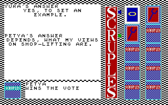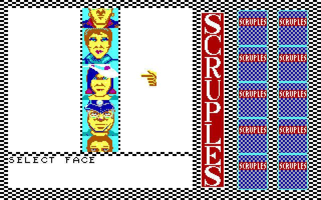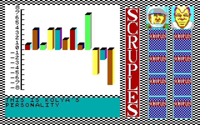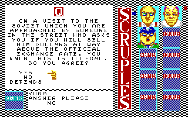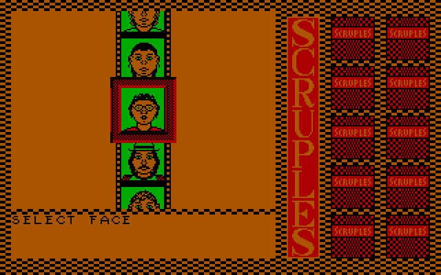 Впрочем, ничто не мешает реализовать то же самое и при помощи ЭВМ: «A Question of Scruples: The Computer Edition» предполагает состязание от трёх до десяти соперников включительно, причём любого из них можно как отдать под управление искусственного интеллекта, так и выставить в качестве «аватара» одушевлённого игрока, сидящего за одной клавиатурой вместе с не менее живыми друзьями. Сразу же после запуска необходимо определиться с количеством участников – и с тем, является ли каждый из таковых компьютерным персонажем. Всего здесь заявлено 64 готовых личности, от священнослужителей до гангстеров, – каждая со своими индивидуальными характеристиками; выбирать оппонентов нужно по портретам, а вот имена им всем придётся вводить вручную. Кстати, о графике: в PC-версии «Scruples» поддерживаются адаптеры CGA и EGA; версии эти запускаются по отдельности и разительно отличаются друг от друга качеством картинки. Как нетрудно догадаться, к применению настоятельно рекомендуется именно второй вариант: в этом случае игра выглядит очень даже недурно – на уровне Atari ST и получше, чем у Commodore 64, Amstrad CPC и ZX Spectrum. А вот звук и музыка на платформе от IBM – в отличие от всех прочих изданий! – по непонятной причине отсутствуют начисто.