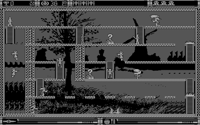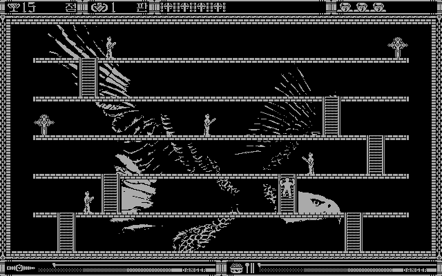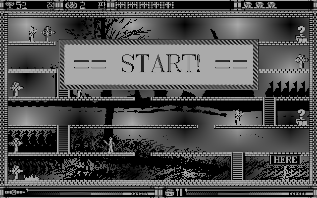 Весь интерфейс представлен почти полностью на корейском языке, - к счастью, текста тут совсем не много, и разобраться, что к чему, труда не составит. Главное меню встречает нас тремя кнопками: правая выводит назад в систему, левая начинает новую игру, а средняя позволяет перейти сразу к любому из тридцати шести здешних уровней. Каждый из таковых представляет собой один-единственный экран, полный тех самых платформ - горизонтальных "этажей", соединённых вертикальными лестницами и населённых как монстрами, так и сокровищами. Последние здесь практически все одного вида - это большие, ростом с человека, крестики, которые необходимо собрать все до единого, дабы уровень считался завершённым.