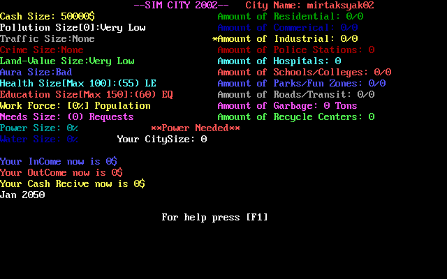 Любительский градостроительный симулятор, реализованный полностью в текстовом режиме (!) и вдохновлённый, судя по названию, культовой серией SimCity.