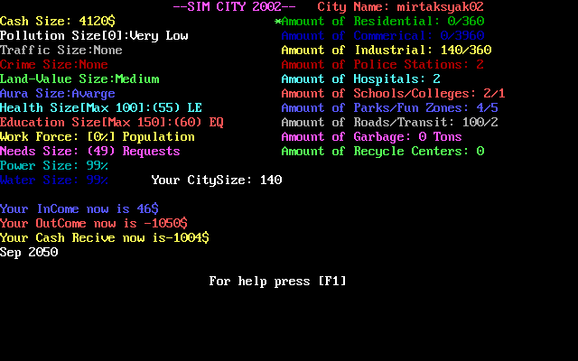 Всё, что мы будем видеть на экране на протяжении всей игры, - два списка; в первом ведётся статистика со значениями различных показателей, а во втором - что и в каком количестве построено в городе. Дабы не путаться в строчках, каждая в обоих списках окрашена отличным от остальных цветом. На возведение объектов того или иного типа отведена своя кнопка, а нажав F1, можно быстро вывести на экран весь список команд.