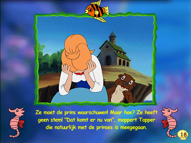 В целом выпуск о "Русалочке" несильно отличается от Belle en het Beest (1999, Windows) - диска из той же серии по мотивам "Красавицы и чудовища". Небольшой аудиорассказ, снабжённый слайд-шоу, сборник песен из мультфильма, пазлы (всего 4 шт.), столько же раскрасок и ещё четыре небольших игры. Вот они получились куда удачнее, чем в вышеупомянутой части серии. Это ловилка экологической направленности - управляем мусорным баком и ловим падающий на дно мусор. При этом надо не просто ловить, а ещё и успевать открывать крышку бака, иначе мусор всё равно упадёт. Следующая игра совсем проста - водим мышью по экрану, управляя движениями зверька в воде и собирая пузыри воздуха. Если долго не брать пузырь, животное начнёт задыхаться и игра закончится. Затем идут традиционные парные карты, выполненные, однако, очень красиво - карточки имеют форму рыб! Завершается всё экстравагантной "активностью", в которой можно играть на ксилофоне, водя палочкой по зубам кита (!). Есть функция записи мелодии, и последующего воспроизведения, и даже сохранения в компьютере.