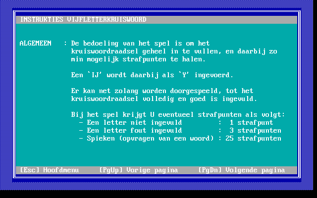 Как ясно из названия, все слова в кроссворде пятибуквенные. Сетка представляет собой квадрат пять на пять клеток, в которой всего шесть слов. Список вопросов дан в верхней части экрана. Слово, которое планируется вписать, выбирается клавишей от 1 до 6, затем нужно ввести его с клавиатуры и нажать Enter. Как и в Kruiswoord, каждое слово можно открыть за четверть сотни штрафных баллов, но их накопление ни на что не влияет.