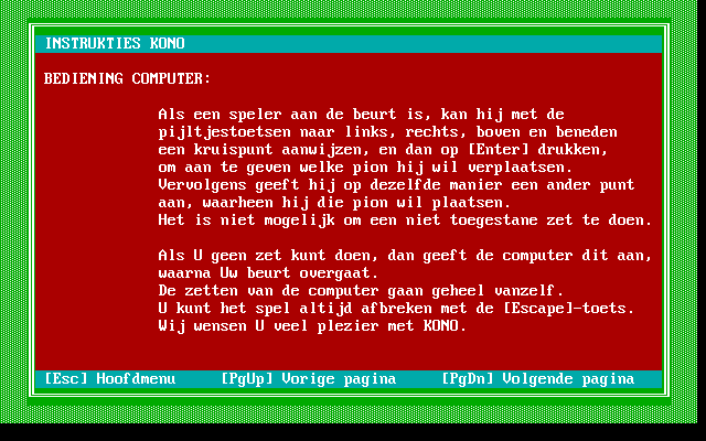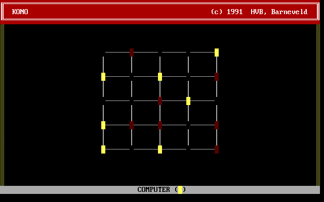 Мешать сопернику реально, только блокируя его ходы, на чём и основывается стратегия игры. В Kono можно соревноваться с товарищем, а можно противостоять искусственному интеллекту, причём играет он так себе. Графика чисто схематичная и не выходит за пределы ASCII-символов: белые линии на чёрном фоне, а фишки выглядят как жёлтые и красные прямоугольники.