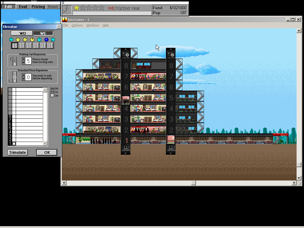 - Развивать Башню лучше в ширину - чем ближе лифтам приходится ездить, тем они эффективнее. Жители не так сильно обижаются что до лифта далеко идти, как их расстраивает долгое его ожидание.