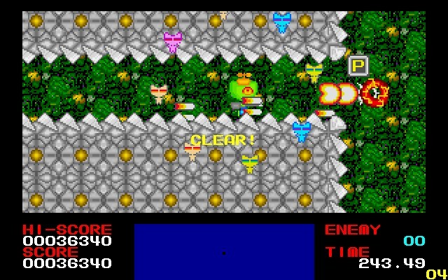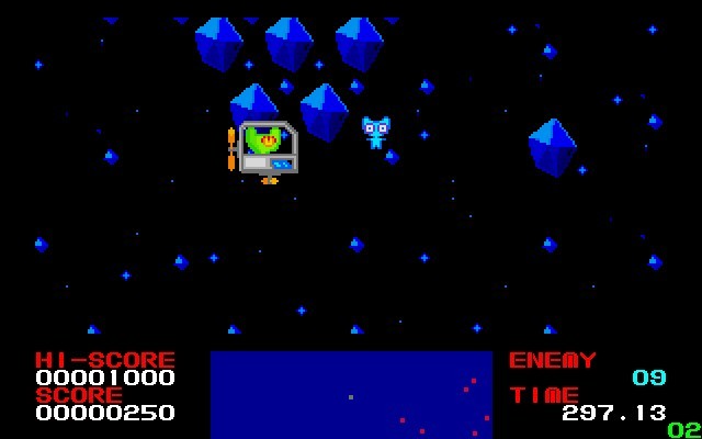 Итак, знакомьтесь, тут у нас зелёный инопланетный кот Турб ещё до событий первой основной части. Собственно, это всё, что сообщается игроку в местном ReadMe. Повествования и заставок нет, так что перейдём сразу же к описанию местного процесса. Итак, нашему одноглазому инопланетянину, сидящему в звездолёте, на каждом лабиринтоподобном уровне необходимо уничтожить энное количество врагов за ограниченное время (300 секунд). Стрелками летаем, клавишей Z стреляем. Вид сбоку. У персонажа одна жизнь, которая теряется после двух попаданий по нему. От первого, однако, взрывается звездолёт. В принципе, какими-либо особыми характеристиками навроде высокой скорости или маневренности он не обладает, играя роль бронежилета на один раз. Среди врагов имеются некие враждебные пузыри и, видимо, роботы. После уничтожения противника всегда выпадает бонус одного из трёх видов. Буква B даст много очков, кот – добавит соответствующего стреляющего сателлита (максимум – 8 штук), P – усилит все снаряды нашего «отряда». После уничтожения последнего вражины мы переходим на новый уровень. При этом всё заработанное непосильным трудом отнимают, как и возвращают звездолёт, если, конечно, в него попадали. Стоит отметить, что все уровни генерируются случайным образом, что делает каждое прохождение по-своему уникальным.